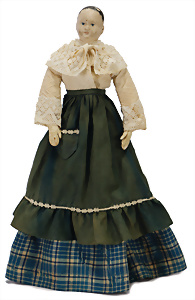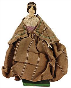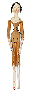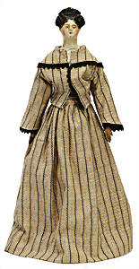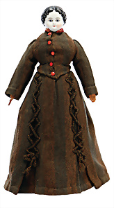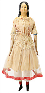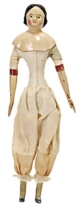 Papiermaché-Puppe, Milliner´s Model, "Adelaida", ca. 1830, SONNEBERG, Papiermaché-Brustblattkopf, leicht modell. Busen, schwarz bemalte Frisur, beidseitig Locken-Tuffs, gemalte Augen, Ziegenleder-Körper, Arme u. Beine Holz geschnitzt, 20 cm, alte Kleidung