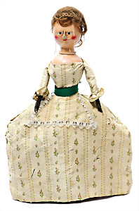 Holz-Puppe, Queen-Ann, 1760, England, Rumpf u. Kopf aus einem Stück Hartholz geschnitzt, schlanker, langer Hals, abfallende Schulter, Brustteil sehr stark ausgeprägt, Echthaar-Perücke, schwarze, pupillenlose Glasaugen, mundgeblasen, geschnitzter Hartholz-Gelenk-Körper, mit 4 Holz-Gelenken, Stoff-Arme, 58 cm, sehr schönes Seiden- Brokat-Kleid, besonders prächtige Ausstattung, Museumsstück, Puppe stammt aus dem Nachlass von Estrid Faurholt und war immer im Privatbesitz der Familie Faurholt
