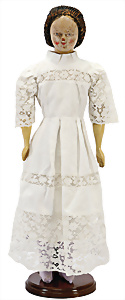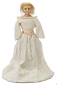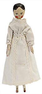 Holz-Puppe, ca. 1870, gemalte Augen, sorgfältig geschnitzte Haare, Stoffkörper, Holzarme mit Schaufel-Händen, Stoff-Füße, 51 cm, weiße Baumwoll-Kleidung