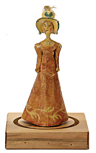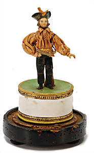 Puppe, ca. 1780, Tragant (ein Zuckergemisch), fein modell., sehr feine Gesichtszüge, aufw. modell. Kleidung u. Hut, altersbed. Rissbildung an der Hose, auf Pappdose stehend,H: der Figur 8cm