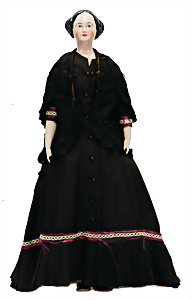 China-Head Puppe, »Antonia (Nicoline)» Kopf aus glasiertem Hartporzellan, rosa getöntes, qualitätsvolles, schweres Porzellan, mod. Busen und Armsatz, sorgfältig bemaltes Gesicht, sehr schöne Ausstrahlung, Haartracht im sog. Dutch-stil: feine geritzte weisse Mittelscheitel, 2 geflochtene Zöpfe wölben sich zu weit ausladenden breiten Haargebilden weit über den Kopf hinaus – wie eine holländische Haube, daher Dutch-Stil, Zopf-Kranzbun, aufwändige Frisur, musste aus mehreren Formteilen zusammengesetzt werden, glasierte Porzellanarme, rosa getönt, weit über den Ellbogen reichend, Stoffkörper mit Stofffüssen. 60 cm, schönes handgenähtes Seidenkleid, vielteilige Unterkleider, Puppe wurde von 2 Generationen bespielt erst von der Mutter 1850 als Kind, später von der Tochter aus dessen Zeit auch das prachtvolle Schleppenkleid aus schwarzer Seide stammt, Diese Puppe wurde ausgestellt im Legoland-Museum in Billund und stammt ursprünglich aus der Sammlung von Estrid Faurholt
