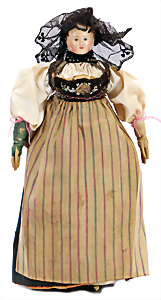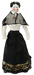 Papiermâché-Puppe ca. 1840 der Firma Löwenthal & Comp., Hamburg, Sehr rare Puppe in absoluter Originalerhaltung, Stoffbeine mit ausgemalten rosaStrümpfen und schwarzen Schnallenschuhen zur Tracht gehörend, Holzarme, Die Puppe trägt ihre Tracht der Vierlande in schönster Erhaltung, Puppen dieses Herstellers sind selten zu finden, Puppe und Bekleidung in unberührtem Zust. aus der Zeit, Puppe trägt die typische, regionale, aufgemalte schwarze Schneppenhaube zur Tracht gehörend, ein Museumsstück, 27 cm