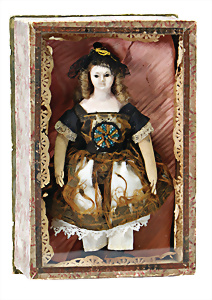 Papiermaché-Brustblattkopf-Puppe mit anmodell. Hut, ca. 1820, Thüringen, kurzes, extrem breites Brustblatt mit modell. Busen, breite nicht abfallende Schulterpartie, gerader wohl geformter Hals, Gesicht leicht zur rechten Seite geneigt, modell. Kinn mit Kinngrübchen, gerade Nase mit breitenNasenflügeln, dunkelrote Nasenpunkte, die Puppe stammt aus dem Museum, „Old Doll ́s and Toys Winter Haven, Florida“ und ist abgebildet im Buch, „The Art of Toys ab 1700“, S. 75, Auflösung des Museums durch Richard Wright, Orig.-Kleidung aus der Biedermeier-Zeit, die einzige uns bekannte Papiermaché-Brustblattkopf-Puppe mit anmodell. Toque (Hut ohne Krempe), 45 cm