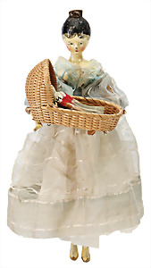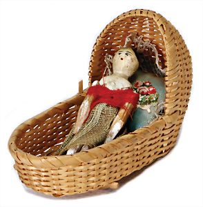 Puppe, einfacher 4-Gelenk-Körper, aus Zirbelkiefer, Kopf mit Nase, 6,5 cm, 1 Puppe, 17 cm, bekleidet mit kl. frühem Korb, schönes Konv.