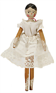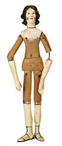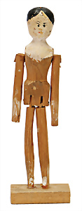 Holz-Puppe, 25,5 cm, Kopf u. Rumpf in einem Stück geschnitzt, gemalte Haare, hervortretende Nase, bewegl. Arme u. Beine, an den Kniegelenken gegliedert, schöner Orig.-Zust., alte Kleidung