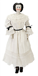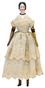 Papiermaché-Brustblattkopf-Puppe, Milliner´s Model "Queen Adelaida"(1792-1849), ca. 1830, Thüringen, zierl. Papiermaché-Brustblattkopf, breites, tiefes Brustblatt, anmodell. Busen, kurzer stämmiger Hals, blau / grün gemalte Augen, stark modell. schwarze, bemalte Haare mit Mittelscheitel, die Haare streng u. glatt, bis zu den Schläfen gekämmt, bei den Schläfen über die Ohren, die Haupthaare sowie die Hinterhaare straff zu einem sehr hohen Apollo-Knoten über dem Kopf zusammengenommen, der Apollo-Knoten wird geschmückt durch 1 kl., modell. Zöpfchen, orig., weißer, sehr schlanker, handgenähter Ziegenleder-Körper, Hände u. Füße aus Holz geschnitzt, 23 cm, mehrteiliges Orig.-Baumwoll-Spitzen-Kleid aus der Zeit, sehr schöner Orig.-Zust.