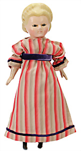 Außergew. Papiermaché-Brustblattkopf-Puppe, Milliner ́s Model, „Alice im Wunderland“, 1867, SONNEBERG, Papiermaché-Brustblatt, tiefes Brustblatt, kurzer stämmiger Hals, rundes Gesicht, kindl. Gesichtsausdruck, schwach modell. Ohren, blonde modell. Haare, Frisur nach Alice im Wunderland, Kurzhaar-Frisur, die Haare aus dem Gesicht nach hinten gekämmt, die kurzen Haare werden am Hinterkopf durch 1 schwarzes Haarband gehalten, gemalte Augen, weißer, sehr schlanker, handgenähter Ziegenleder-Körper, Arme u. Beine aus Holz geschnitzt, 28 cm, handgenähte Orig.-Kleidung, teilw. etwas ausgebessert, sehr schöne Orig.-Kleidung, diese Puppe stammt aus der Sammlung von Madeleine Osborn Merrill und ist abgebildet in ihrem Buch »The Art of Dolls 1700-1940» S. 35