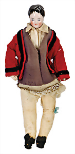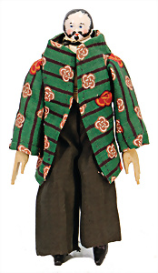 Puppenstuben-Puppen-Mann, ca. 16 cm, lasierter Brustblattkopf, fein gemalte Haare als Haarkranz bis in das Gesicht hinein, aufgemalter Schnurrbart, Backen u. Kinn, gemalte Augen, gegliederter Holz-Körper mit fein geschnitzten, langen Fingern, separater Daumen, für frühe Puppenstube