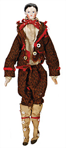 China Head (glasiertes Porzellan), Brustblattkopf-Puppe, Mann, 28 cm, fein ausmodell. Haare, einzeln gemalte Haare in das Gesicht, blaue gemalte Augen, geschl. Mund, gegliederter Holz-Körper mit Gelenken in Armen u. Beinen, Orig.-Kleidung, stärker verschlissen, aufgenähte Stoff-Stiefel, 1840