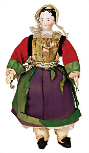 Sog. Larven-Puppe aus Pappenzeug, Nürnberg ca. 1750 Gesichtsmaske(Larve) aus Pappenzeug hinunterreichend bis zu einem extrem ausmodell. Busen, braun gemalte Haare, gemalte Augen, lächelender Mund, unbeweglicher, originaler Körper aus grober Leine prall gestopft mit Werg (Niederqualität bei der Flachsverarbeitung), mit langen, einzeln abgenähten Fingern, Original-Bekleidung: Berner Sonntagstracht aus dem 18. Jahrhundert mit allen Details, Puppe ist absolut unberührtem Zustand in tadelloser Erhaltung, ein Museumsstück, ein hochinteressantes Zeitdokument von kulturhistorischer Bedeutung, Puppe stammt aus einem Schloss bei Gstaad Anmerkung: Die Herstellung von Docken (altdeutsches Wort für Puppen) aus Pappenzeug wird erstmals im «Weigel Ständebuch» erwähnt, Regensburg 1698, Faksimile-Neudruck der Ausgabe 1698, Nördlingen 1987, siehe 219 ff. / siehe auch «Deutsche Papiermâché-Puppen 1760-1860» Christiane Gräfnitz S. 19-24