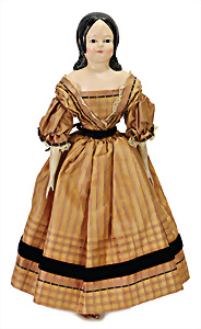 Papiermaché, Brustblattkopf-Puppe, Milliner Model "Adelaida", ca. 1830, SONNEBERG, Brustblattkopf, tiefes Brustblatt, schwarze, bemalte, sehr stark hochmodell. Haarpracht, Frisur nach der engl. Königin Adelaida, genannt, Ziegenleder-Körper, Holz-Arme u. Beine, Orig.-Kleidung, 26,5 cm, alterseb. Spannungsrisse am Hals, sehr schöner Orig.-Zust., an den Haaren etwas ausgebessert