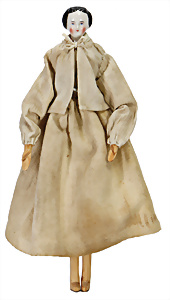 Frühe China-Head (glasiertes Porzellan), Brustblattkopf-Puppe, 1840, tief heruntergezogenes, stark gewölbtes Brustblatt, ohne Busenausmodellierung, strenge einfache Frisur, mit weißer Linie als Mittelscheitel, gemalte Augen, Biedermeier-Körper aus Baumwolle, schlanke Taille, Arme u. Beine aus Baumwollstoff, 55 cm, Kleidung aus der Zeit