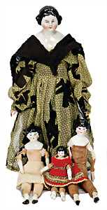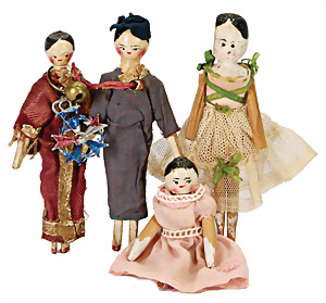 4 Teile Puppenstuben-Puppen, China Head, Brustblattköpfe, kl. Puppen mit Biskuit-Armen u. -Beinen, einfache Stoffkörper, 10-25 cm