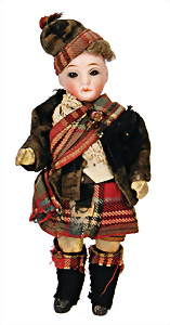 Puppenstuben-Puppe, Schotte, ca. 1890, 14 cm, Biskuit-Kurbelkopf, gem. Germany 13, dunkle, fest eingesetzte Glasaugen, geschl. Mund, Masse-Stehkörper, Orig.-Schotten-Kleidung, Orig.-Mohair-Perücke,