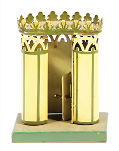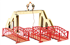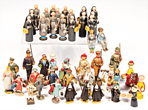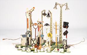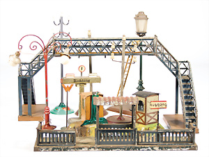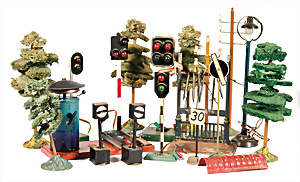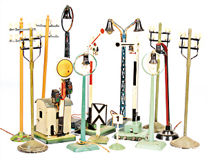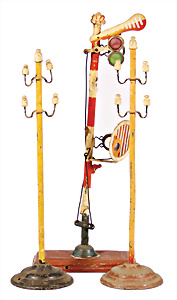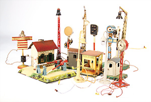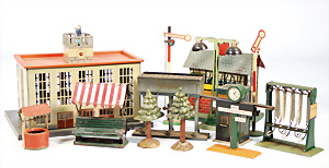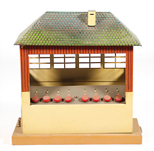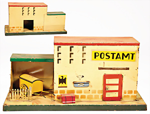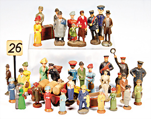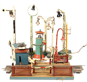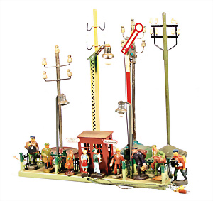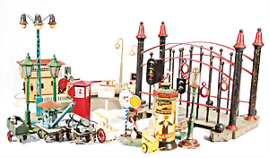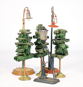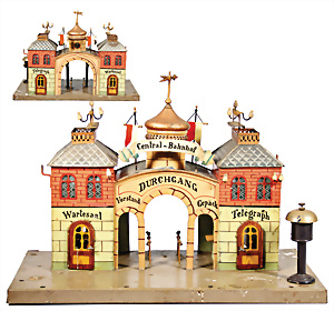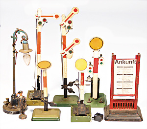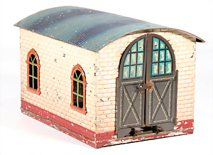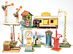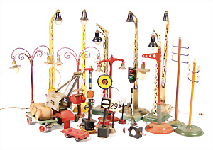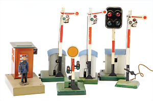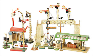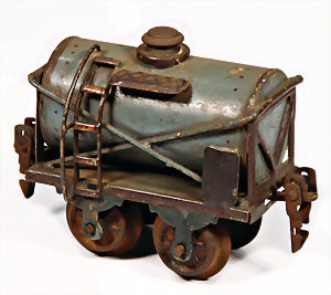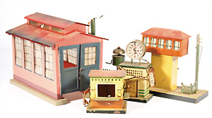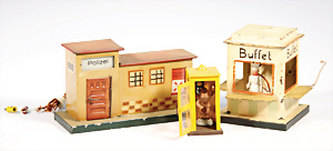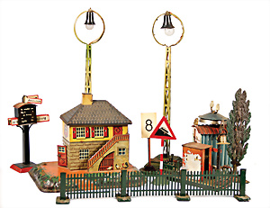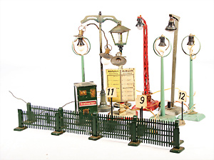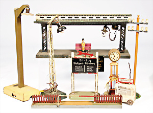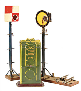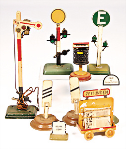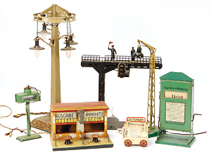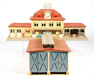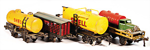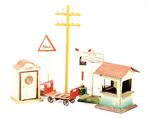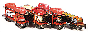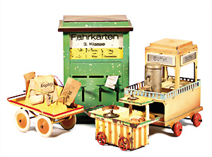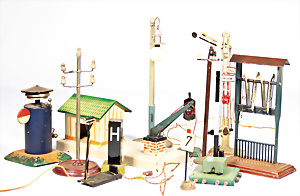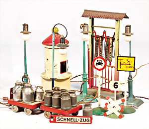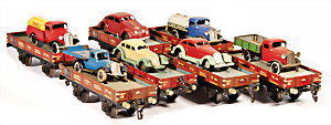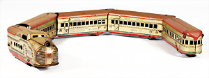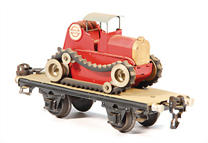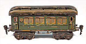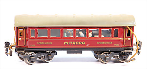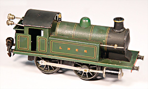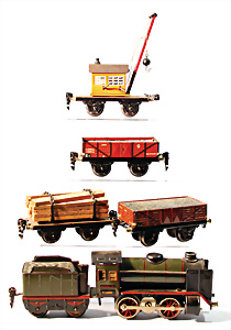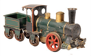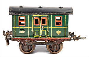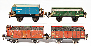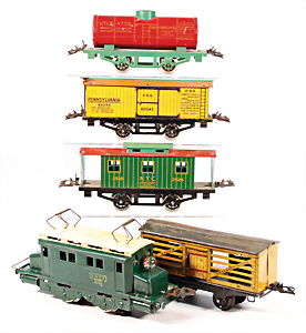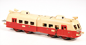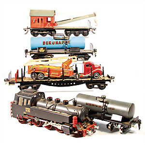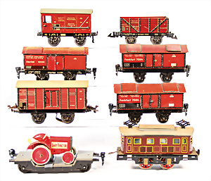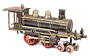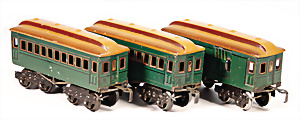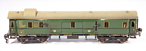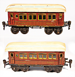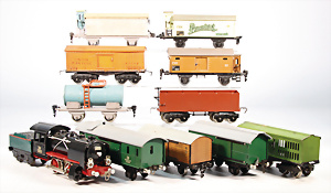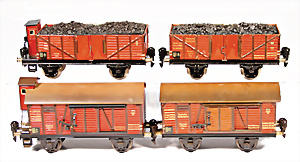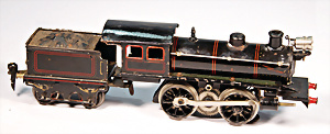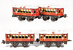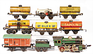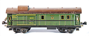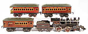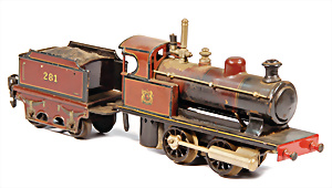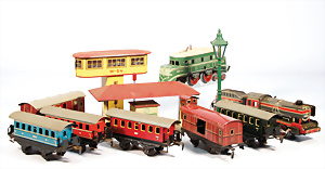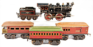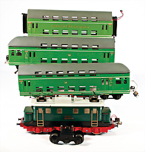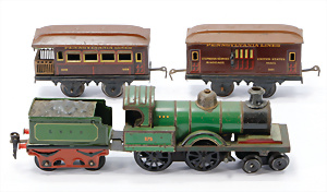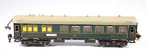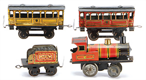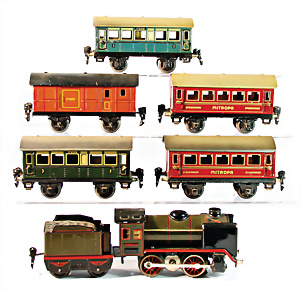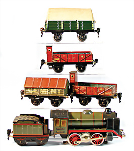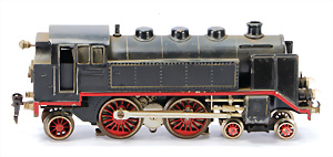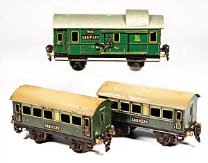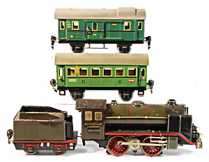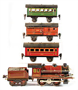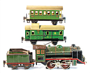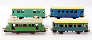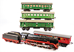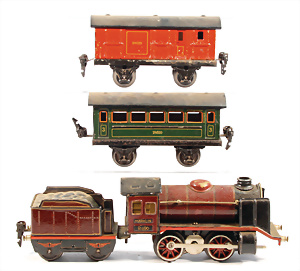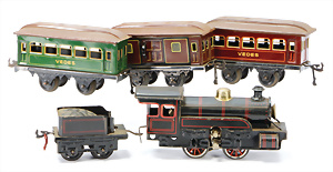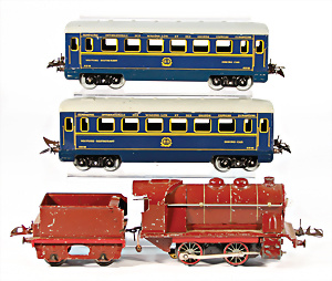 Spur 0, R12950N, Schlepptender-Lok, B, rot / schwarz mit gelben Zierlinien, Dach wohl farbl. überarbeitet, dazu 1721, Personenwagen, 2. Klasse, rot, 1721, Personenwagen, 2. Klasse, grün, leicht bespielt guter Zust., 1 Gepäckwagen, 1722, Lackfehler am Dach