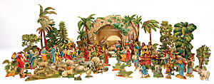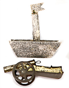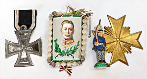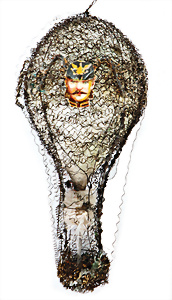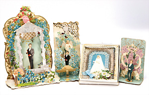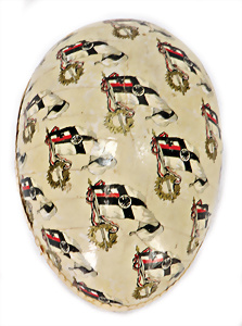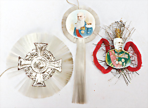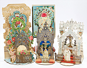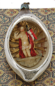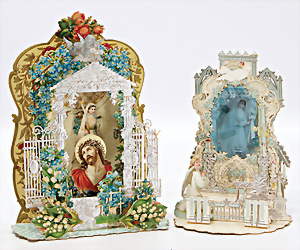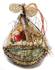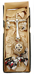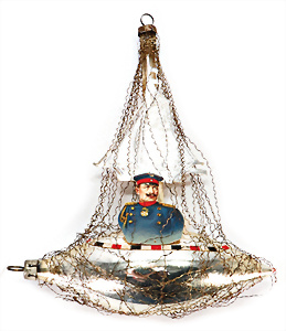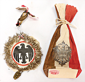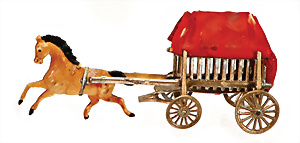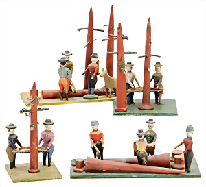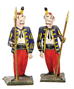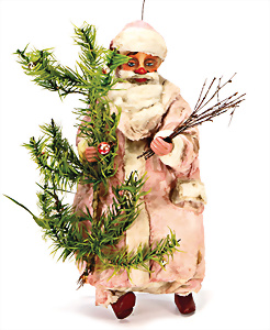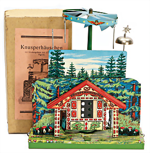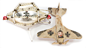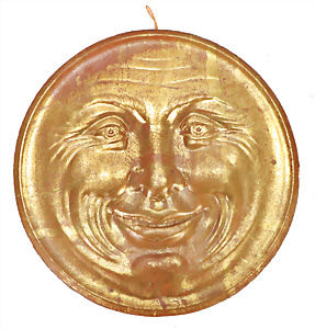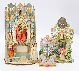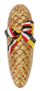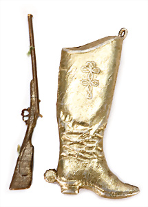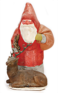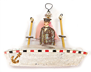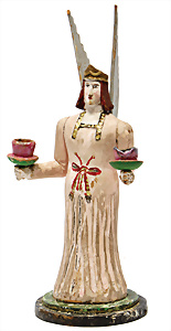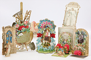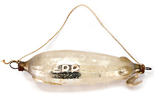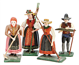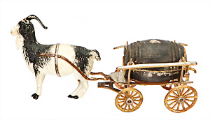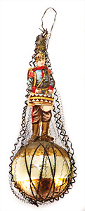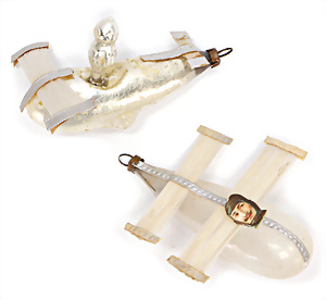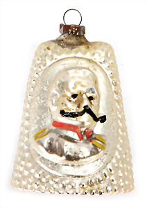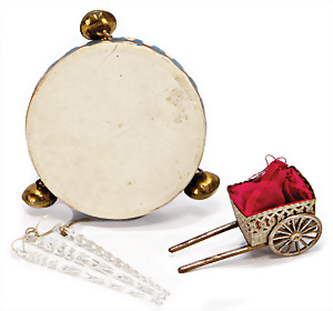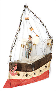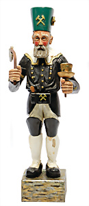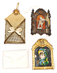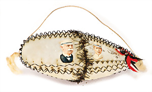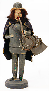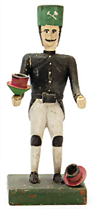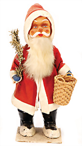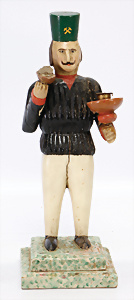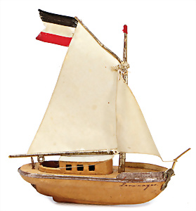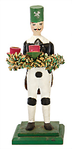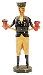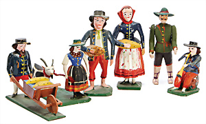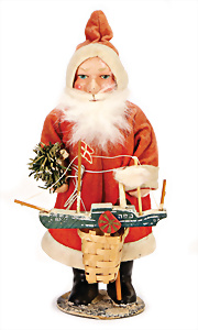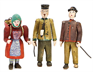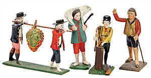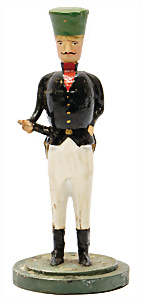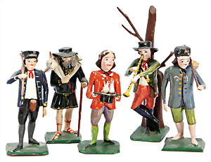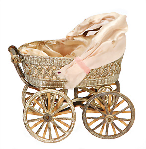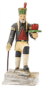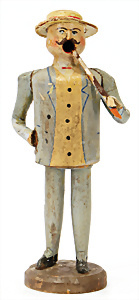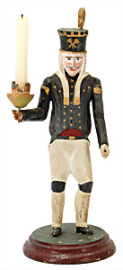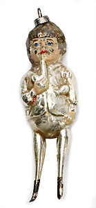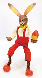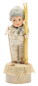 Stirn, außergw. Frisur, hellblaue gemalte Augen, franz., hochw., handgenähter Leder-Körper, kräftiger Körperbau mit vielen Nähten, Holz- Arme mit geschnitzten Händen, Beine u. Füße sind über den Lederkörper gemalt, aufgemalte Stiefel mit roter Schnürung, 45 cm, einfache Baumwoll-Unterkleider, der Puppe liegt ein Schreiben ein über die Vorbesitzer, siehe auch «Antike Puppen», Lydia Richter, Seite 167