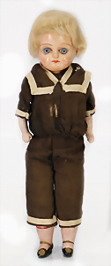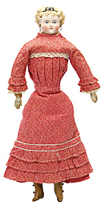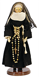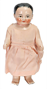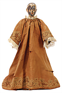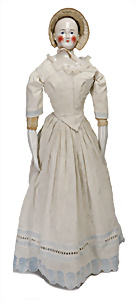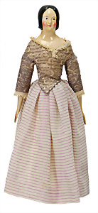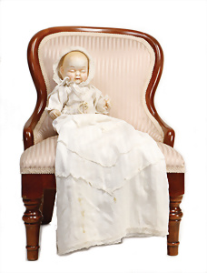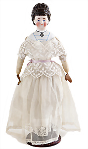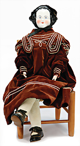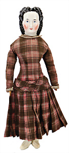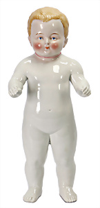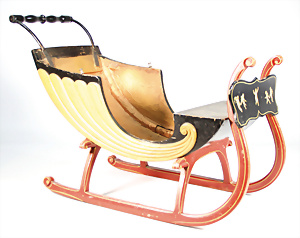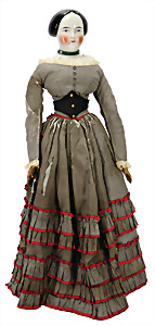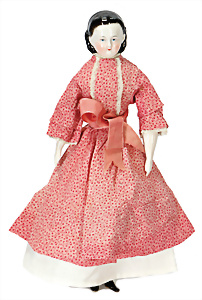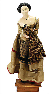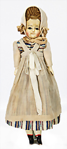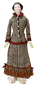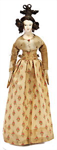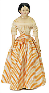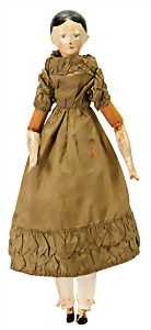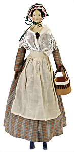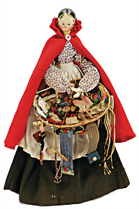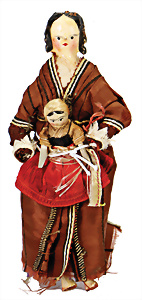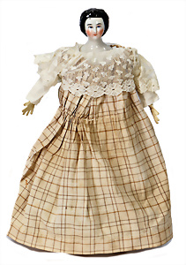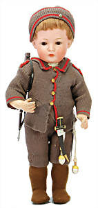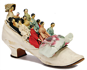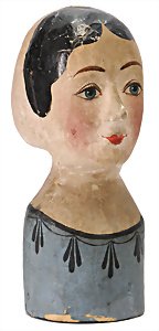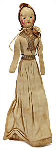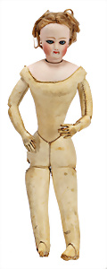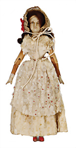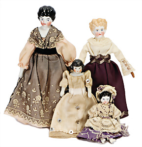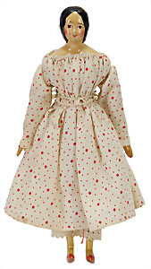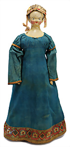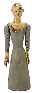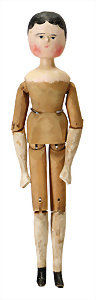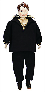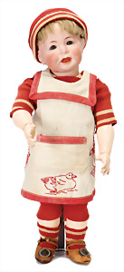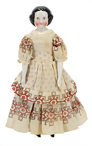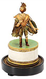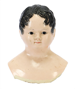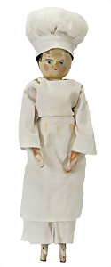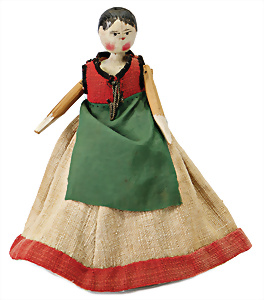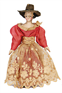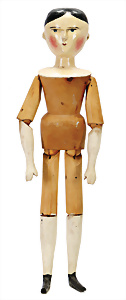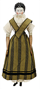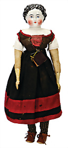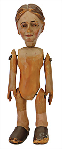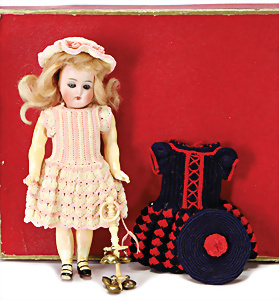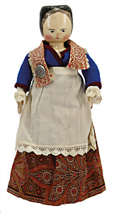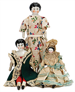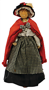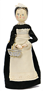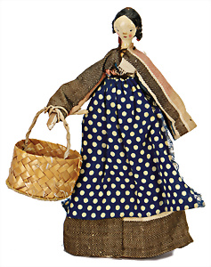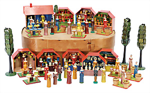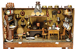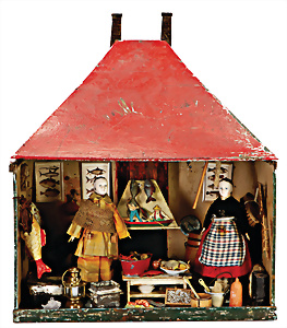 Norddeutsche Fischräucherei, ca. 1830, Fischerkatte (Katte = ärmliches, kleines Haus), aus Holz, Teile der Originalfassung erhalten, rot bemaltes, abgeschrägtes Dach, 2 Schlote, Hinterseite der Hütte ist abgeflacht, fest eingebaute, fünfeckige Fischräucherstelle, Herd vorne mit 2 Kochlöchern, hinten grosse Feuerstelle zum Räuchern der Sprotten mit Erlenholz, welches an der Wand aufgehängt ist, im Kamin ist eine Querstange angebracht, woran die Fische im Kamin geräuchert werden. Vielteilige und reichhaltige Bestückung einer Fischräucherei: Fische mit Haken im Mund, Fischrechen, Korb mit Muscheln, Aschebehälter, Laugenbad mit Deckel, Bottich, Kiste mit Sprotten, Seil, Netz, Fischerstiefel, Verkaufstisch mit grossem Angebot, und dergleichen mehr. B: 42cm, H 49 cm inkl. Kamine, T 21.5 cm, dazu der Fischer in typischem Fischer-Anzug, mit Fischerstiefel, und Netz, ca. 1830, 20 cm und seine Frau, in Arbeitstracht, 1830, 19 cm. Bei beiden Puppen sind Milliner’Model des sog. «Sonneberger Typ» bezieht sich nur auf den Kopf, Brustkopf aus Papiermâché, Ziegenleder-Körper, Extremitäten aus Holz,