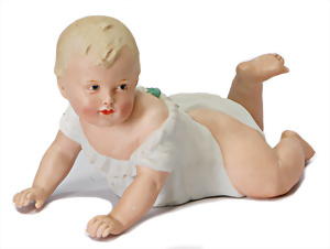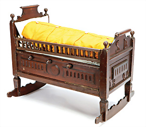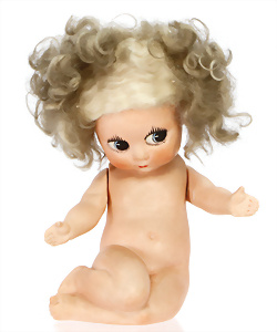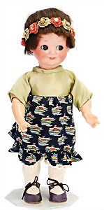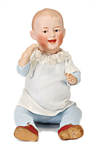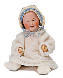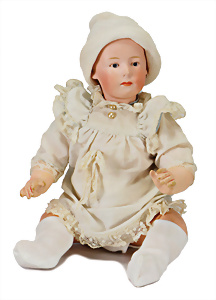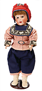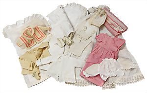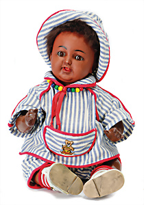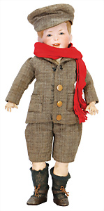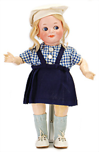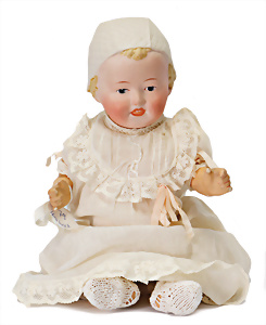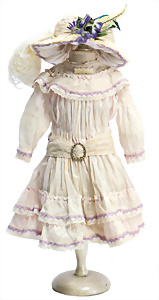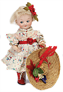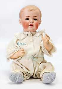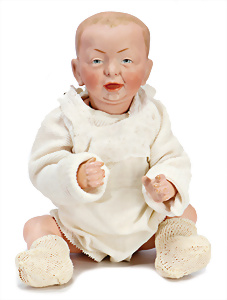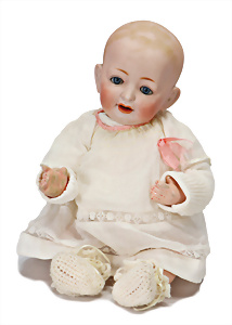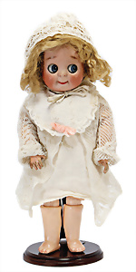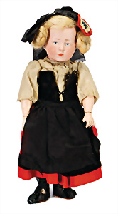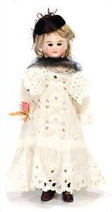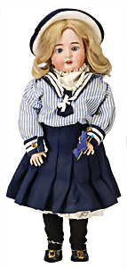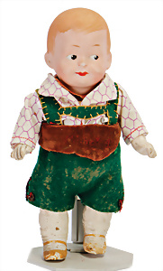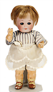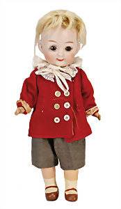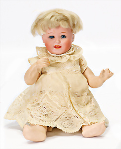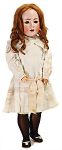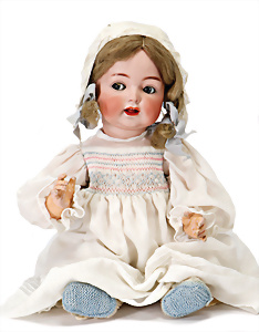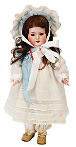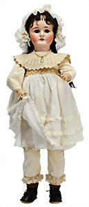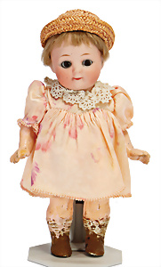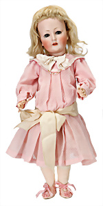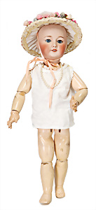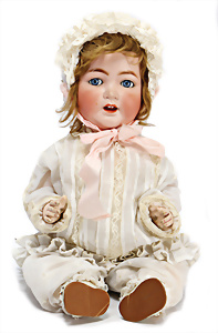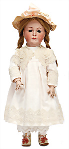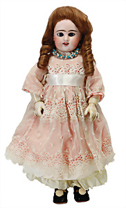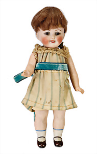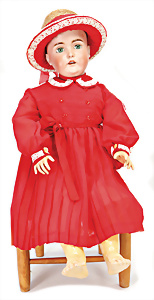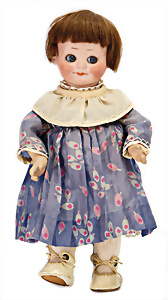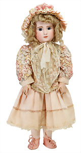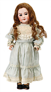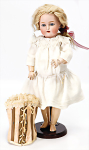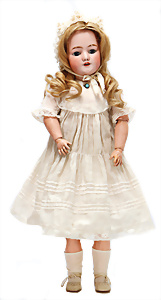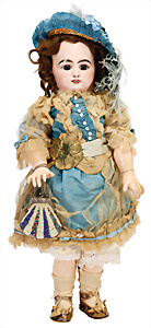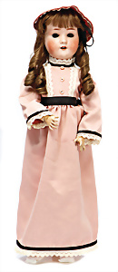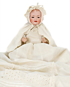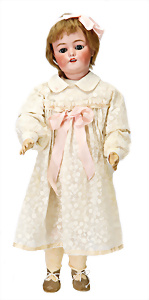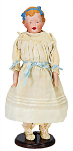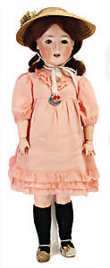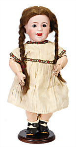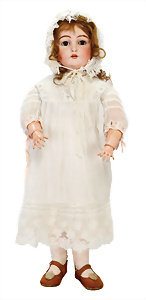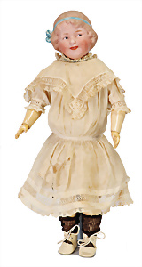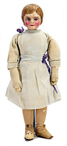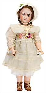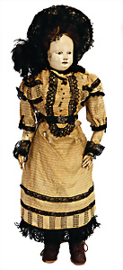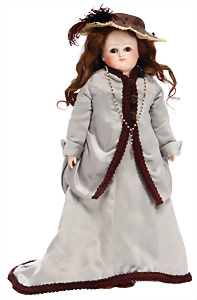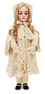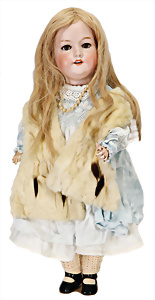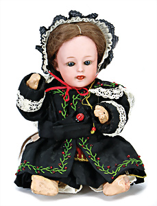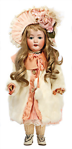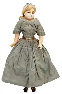 Papiermaché-Brustblattkopf-Puppe, ca. 1850, 54 cm, aufgemaltes Unterhaar, aufgesetzte Mohair-Perücke, lose, fest eingesetzte, pupillenlose Glasaugen, off. Mund, Zähne, Leder-Körper, mit separat abgenähten Fingern, breite Hüfte, schmale Taille, schöne alte Kleidung u. Unterkleidung, alte Schuhe, Seide altersbed. verschlissen, teils alte Bemalung