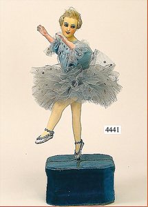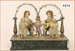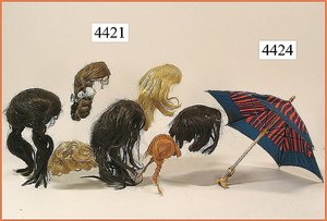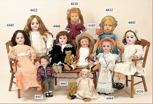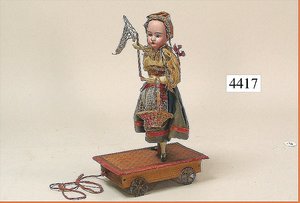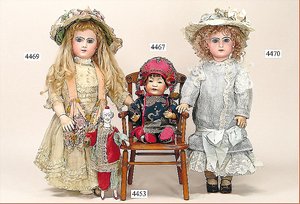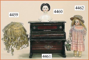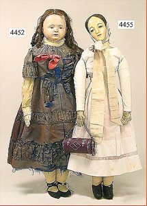 Biedermeier-Puppe, Papiermaché-Brustblattkopf, Typ Pauline, 80 cm (ausgef. Gr.), braune fest eingesetzte Glasaugen, off. Mund, Zähne u. Zunge, aufgemalte Haare, darübergeklebte Orig.-Perücke, schöner ausgeformter Lederkörper, mit breiter Hüfte, sowie ausgeformten Waden, einzeln abgenähte Finger, Masseabplatzer ca. 2 cm, über dem linken Ohr, kl. Ausbruch hinten am Brustblatt, Orig.-Kleidung u. Unterkleidung, Seide etwas verschlissen