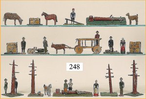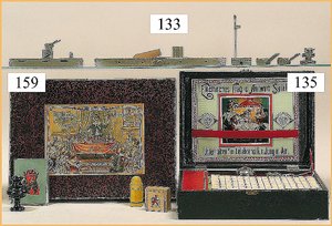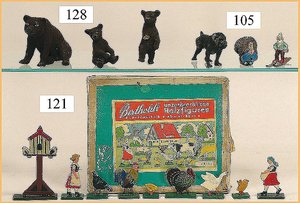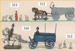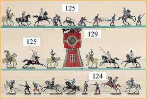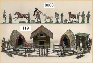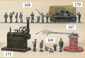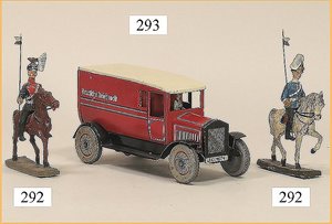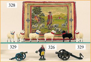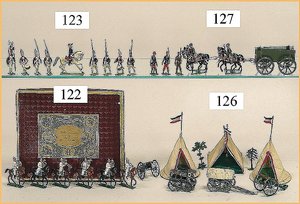 21 Bleifiguren, 5,5 cm, Marschierend, sowie Musiker, 1 Fahnenträger, dazu 1 Reiter, plastisch, im Orig.-Kart., guter Zust., Deckel am Kart. Verschlissen (n. a. T. f.)