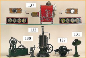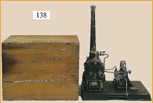 MÄRKLIN Dampfmaschine, Grundplatte 39 x 35 cm, Kesseldurchm. 9,5 cm, altes MÄRKLIN-Zeichen, Orig.-Schornstein, Wasserstandsglas u. Brenner fehlen, in Orig.-Holzkiste, insges. guter Zust., techn. nicht geprüft