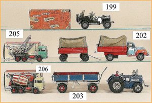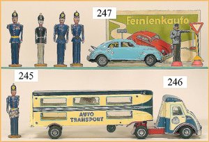 HANS RUFF, Zirndorf Autotransporter, 1954, alte Ausführung, mit Cellophanfenster in der Zugmaschine, Uhrwerk intakt, bespielt, Lackierung Dach am Anhänger Orig.?, selten