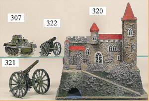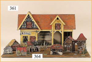 ERZGEBIRGE Dorflandschaft, Papiermaché, Stadttor mit Turm, 16 cm, brennendes Haus, Fachwerkhäuser, insges. 6 Teile, dazu 3 kl. Bäume, Häuser mit Aufkleber am Boden: Bernhard Keilich, grösstes Spielwaarengeschäft der Welt, Berlin, Hamburger-Str. 21/23