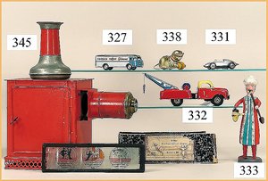 Laterna Magica, Blech handlackiert, um 1900, 1x umgebaut auf elektr., Lackfehler, dazu gr. Konv. ca. 40 Glasstreifen, 22 x 5,5 cm, 9 Teile bewegl. Bilder, Farbenrad, sowie figürl. Darstellungen (n. a. T. f.)