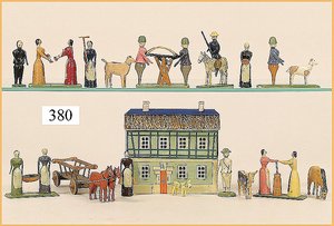 ERZGEBIRGE 4 Paarfiguren, 5 Figuren einzeln, 1 Reiter, 1 Mann mit Hund, 7 cm, Holz, mit angedeuteter Nase, handlackiert, ca. 1880, einige Tierfiguren, 1 Leiterwagen, 1 Gebäudeteil, versch. Berufe, sehr guter Zust., museal