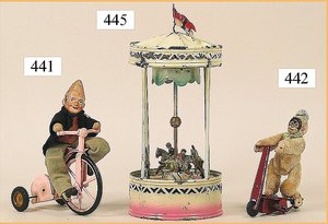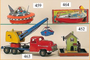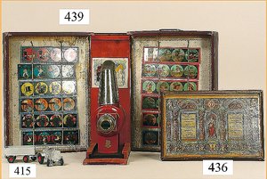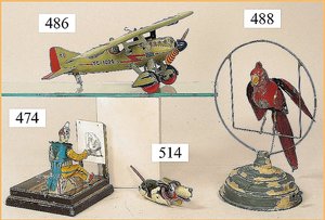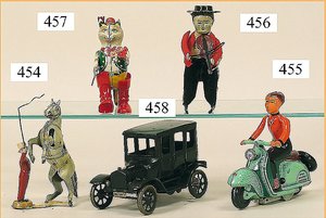 zeichnender Clown, Kurbelantrieb, Blech lithogr., mit Orig.-Platte, zeichnet gallischen Hahn, Grundplatte 12,5 x 12,5 cm, ein wenig Abriebstellen am Litho des Bodens, sonst bis auf kl. Stellen guter Zust., ca. 1910, ausgef.