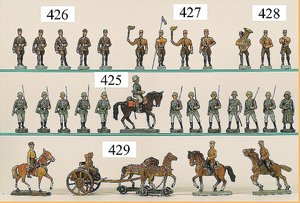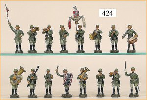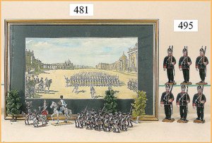 76 plastische Zinnfiguren, 5 cm, wohl HAYDEN, Preussen, Marschierend, Musiker, 1 flache Figur, 7,5 cm, 2 Reiter, passend zu 5 cm, 1 Reiter mit Pferd, 9,5 cm hoch, mit Bildnis, Preussenparade, 51,5 x 34 cm