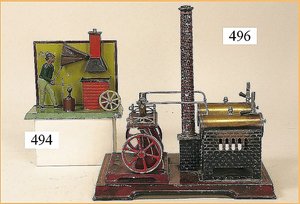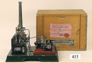 MÄRKLIN Dampfmaschine, Nr. 4146/6, liegender Kessel, Grundplatte 29 x 33 cm, mit Brenner, Wasserstandsglas, Pfeife, nahezu unbespielt, mit nur geringen Brandspuren am Kessel, Orig.-Schornstein, Zubehör, Orig.-Holzkiste