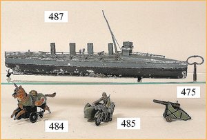 HESS Schiffsflotte, Bodenläufer, Schlachtschiff, 21 cm, mit 6 Beibooten, im Orig.-Kart., Dachbodenfund, Feder liegt lose bei, Drähte zum Formationsfahren liegen bei, bespielt, schöner Orig.-Zust., im Orig.-Kart.