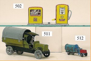 FISCHER, PENNY TOY kl. LKW, Blech, grün, mit Plane, lithogr. Fahrerfigur, Spiralfederwerk defekt, sehr guter Orig.-Zust. 19 cm, schöne Gr. zu Spur 0 u. 1