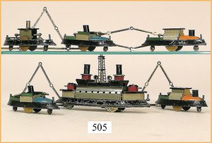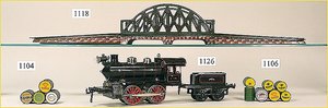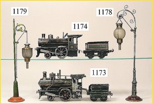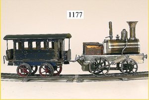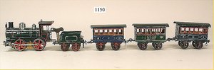 SCHOENNER Zugpackung, Spur 8, Orig. von FEO Schwarz, New York, Orig.-Holzkiste, Gleis oval, Spiritus betriebene Lokomotive, mit Brenner, für freistehenden Heizer, 18,5 cm, dazu 1 Aussichtswagen, altersbedingte Lackfehler am Wagen, sonst sehr guter Zust., museal, ca. 1880