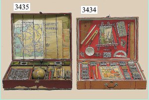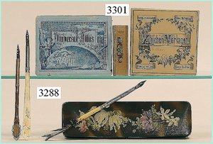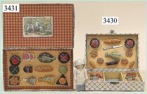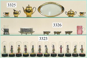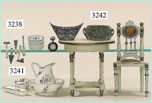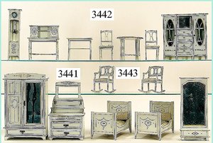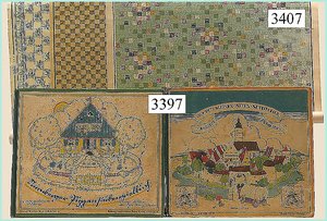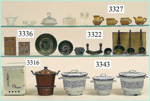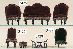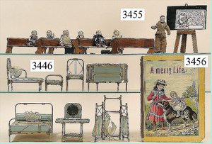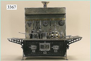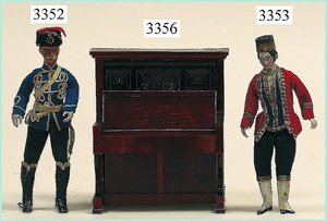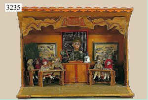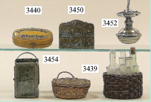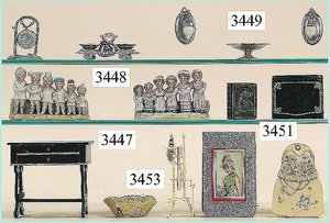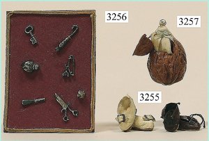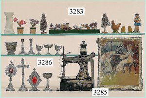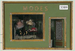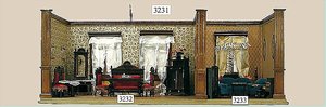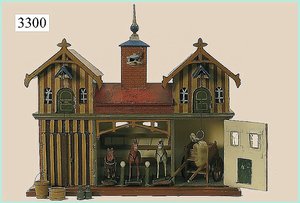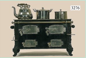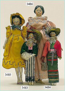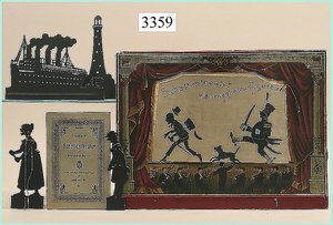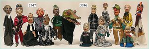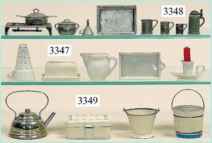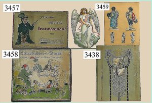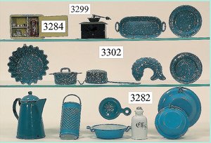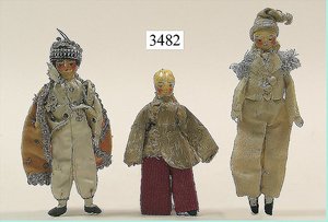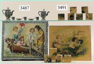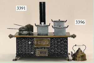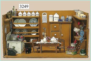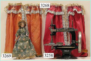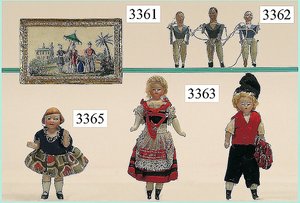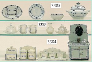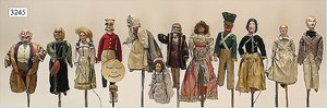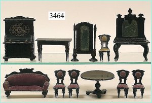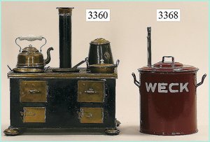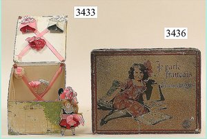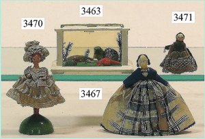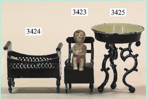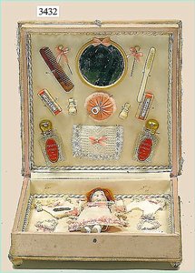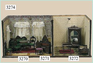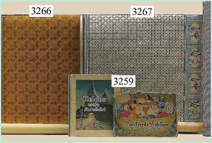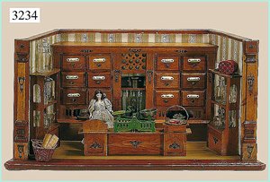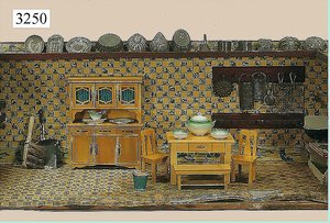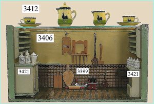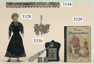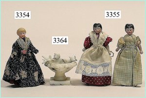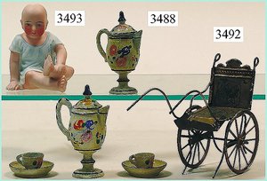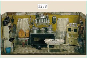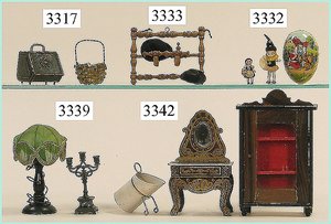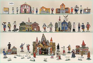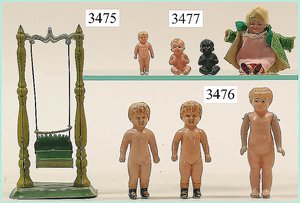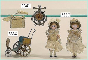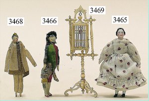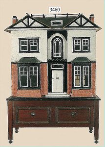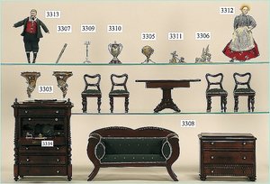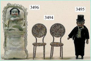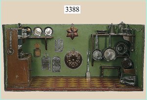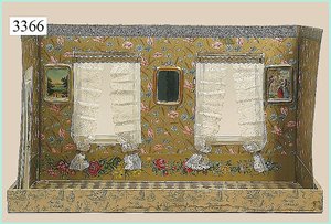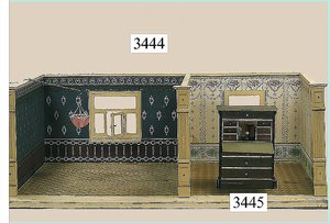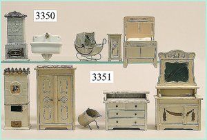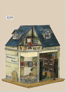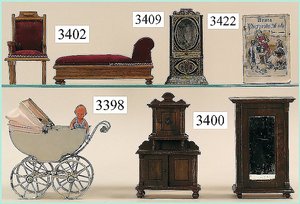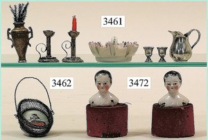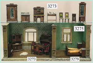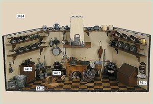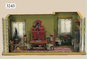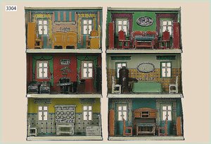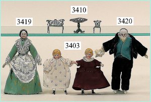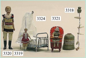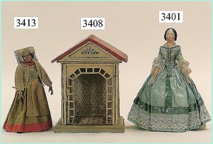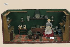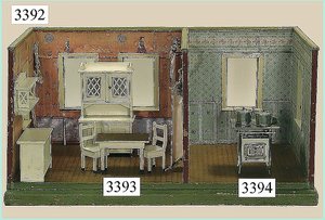 Puppenstuben-Haus, mit Spieltisch, Gesamthöhe 1,20 m, Haus abnehmbar, Höhe Haus 80 cm, 87 cm breit, Fassade zum Öffnen, Treppenaufgang, Toilette, fest eingebaute Küche, Orig.-Tapete am Boden, Wandtapete wohl 20er, 30er Jahre, möbliert, mit reichhaltigem Zubehör, Möbelprogramme u. Zubehör teilw. älter, 5 frühe Puppenstuben-Puppe, Biskuitköpfe, -arme u. -beine, Stoffkörper, alte Kleidung, Backsteintapete, möglicherweise etwas jünger, Fassade außen farblich wohl 1x überarbeitet, um 1910, dekor., schöne Gr.