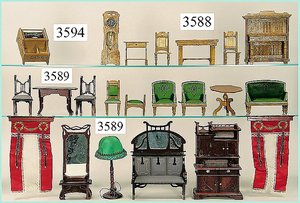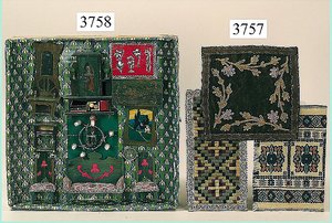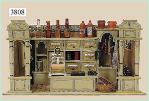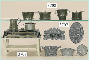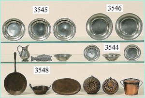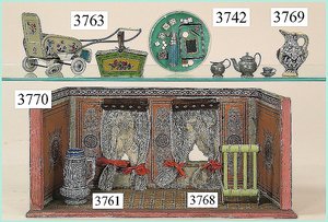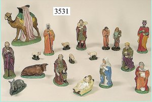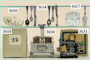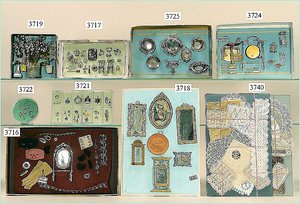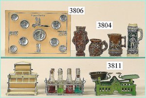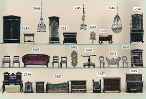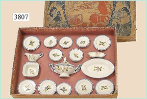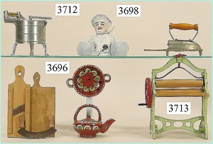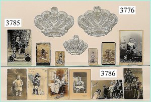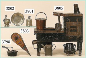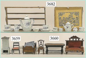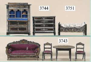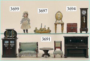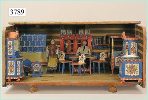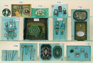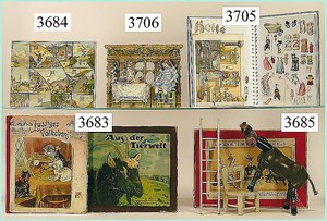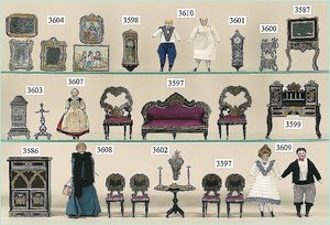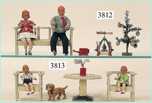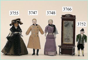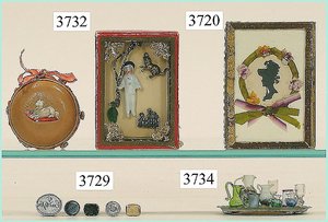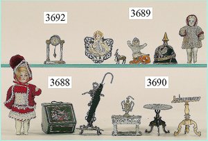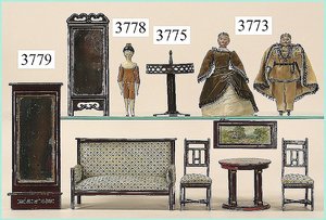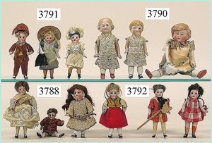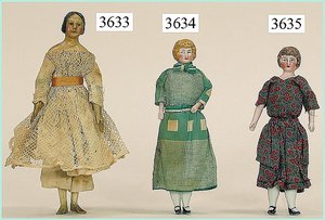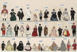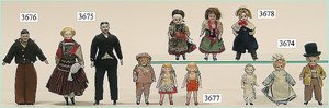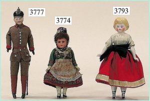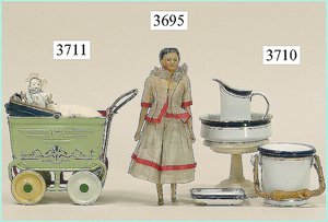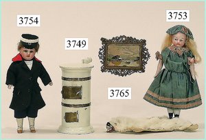 Puppenstuben-Kinder, Steifbeinpuppe, Ganzbiskuit, schwarz, 5,5 cm, 2 Stubenpuppen, Junge u. Mädchen, fester Kopf, fest eingesetzte Glasaugen, 9 cm, Mädchen gemalte Augen, 9,5 cm, kl. Ganzbiskuitpuppe, 3,5 cm, kl. Biskuitpuppe im Steckkissen, kl. Steifbeinpuppe, 5 cm, alles in Orig.-Kleidung