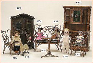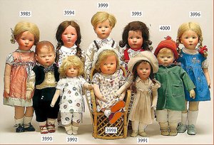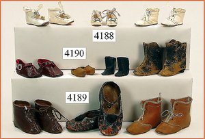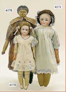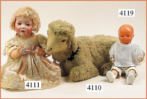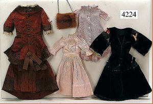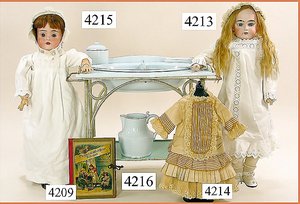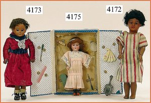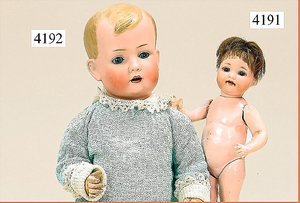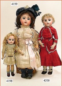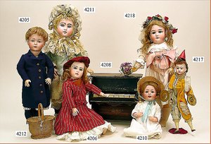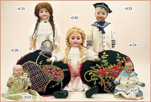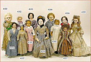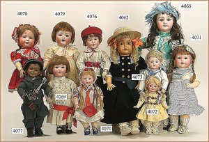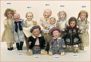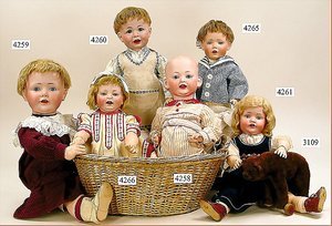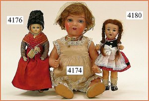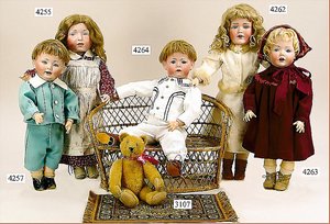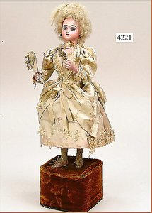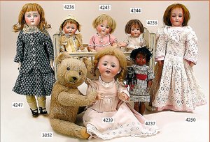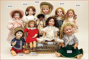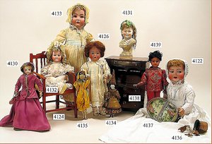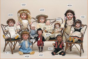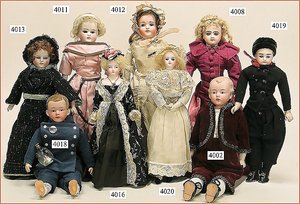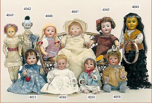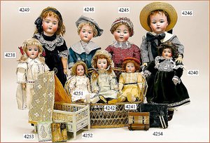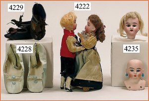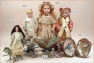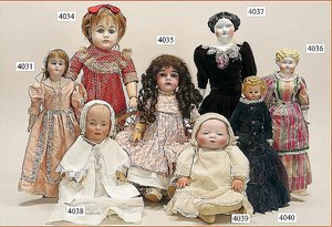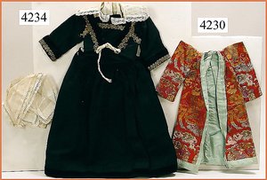 Biskuitporzellankopf-Puppe, gemarkt 8,Bru-Typ, Deutsch für den franz. Markt, Kurbelkopf, braune fest eingesetzte Glasaugen, durchst. Ohren, leicht off./geschl. Mund, schönes helles Porzellan, Orig.-Fellperücke wurde nicht entfernt, von außen keine Risse erkennbar, Gliederkörper mit 8 losen Kugeln, sowie festen Handgelenken, Orig.- Kleidung, Unterkleidung u. Schuhe, Seide teilw. verschlissen, 40 cm, äußerst selten