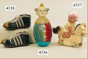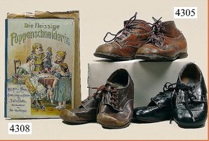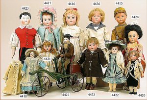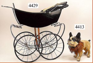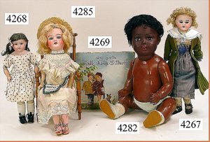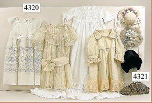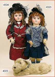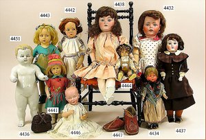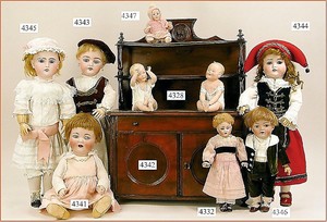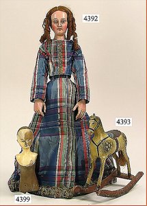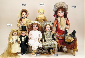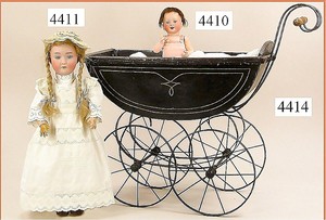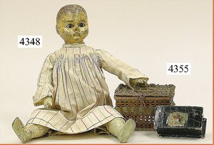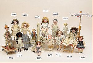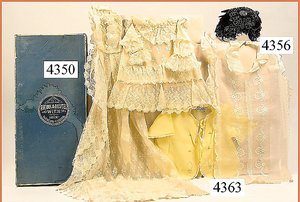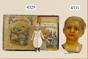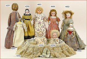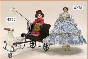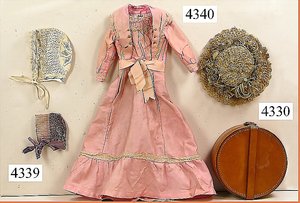 kl. Modepuppe, ca. 1870, 22 cm, Biskuitkurbelkopf, BELTON Typ, blaue fest eingesetzte Glasaugen, geschl. Mund, auf Biskuitbrustblatt, Holzgliederkörper mit Gazestoff übernäht, sowie lange eingelassene Biskuitarme, aufwendig gearbeitete Orig.-Kleidung, mit Mantel, Seidenkleid, Seide an ein paar Stellen etwas verschlissen, mit Spitze, Orig.-Unterrock, Schuhe u. Strümpfe, Orig.-Hut, sehr ausdrucksstark, schönes helles Porzellan, feine Bemalung, selten