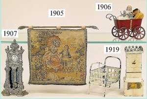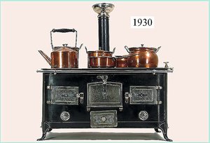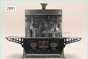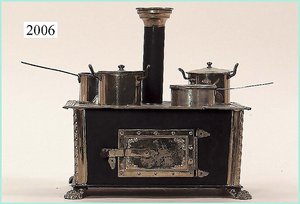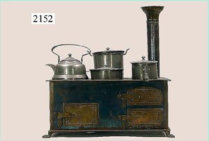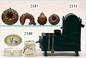 Puppenküchenherd, früh, 43 cm breit, Griffstange vernickelt, vernickelte Türen, mit Brenner, Topfsatz, Kupfer, Wasserschiff mit Hahn, Kessel,. Pfanne, 3 Töpfe, Orig.-Schornstein, beeindruckende Gr., schöner Orig.-Zust, sehr guter Zust.