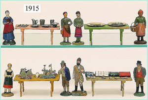 wohl ERZGEBIRGE Marktszene, 8 Figuren, 7 cm, 4 Holztische, mit Spielzeug, Zinnwaren, Gerichte, Stoffwaren