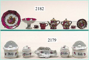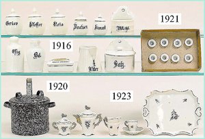 22 Teile Porzellan, mit Rosendekor u. Goldrand, Salz- u. Mehlmetze, 6 Gewürzdosen mit Deckel, 4,5 cm hoch, Tassen meist mit Beschriftung, Milchkannen, Sieb, Eimer, 3 Backformen, Schale, sehr guter Zust., ausgef. (n. a. T. f.)