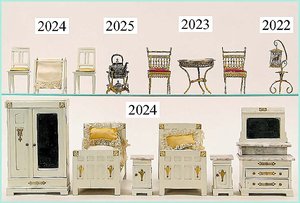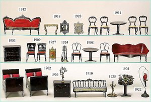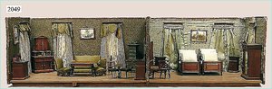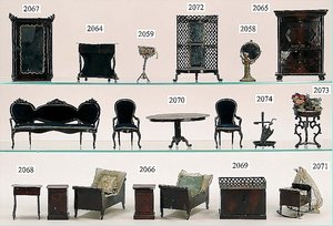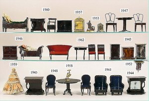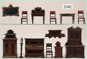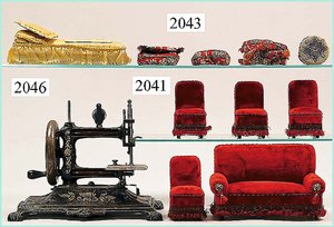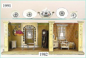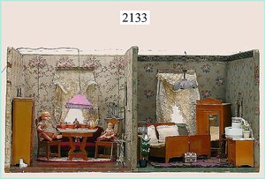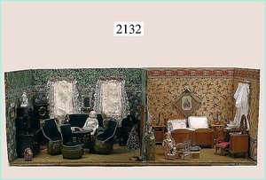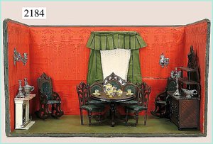 1-teilige Puppenstube, 62 cm breit, 37 cm hoch, hinten 1 Fenster, alte Tapete, aufwendig gearbeitetes Möbelprogramm, mit Sitzgruppe, Bank, Tisch, 15,5 cm Höhe, Schrank 28 cm, grüner Lederbezug, 2 Schaukelstühle, 4 Stühle, Kamin, Blech/Zinn, ERZGEBIRGE, Kaffeeservice, Holz, Zinnleuchter, gr. Zinndeckenlampe, Arme liegen lose bei, 2 Füße an der Bank fehlen