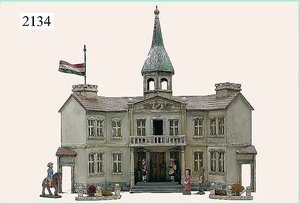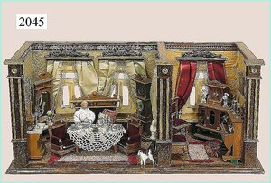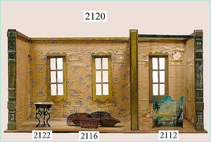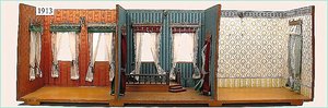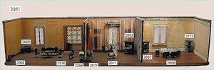 3-teilige Puppenstube, 1,38 m breit, 48 cm hoch, 45 cm tief, 6 Fenster, 2 Durchgänge, alte Tapete an Wand u Boden, Gardinenstangen, -blenden, 8 Teile, Messingblech, kl. Empore mit Treppe, im Mittelraum, 3 frühe Wandhalter für Beleuchtung, schöner Orig.-Zust.