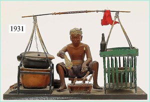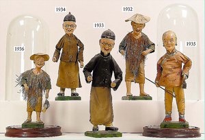 asiatischer Kaufmann, Masse, auf Holzsockel, Kolonialzeit, Rissbildung im Gesicht, Orig.-Kleidung