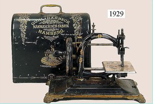 Reise- o. Kindernähmaschine GUHL & HARBECK, Nähmaschinenfabrik Hamburg, schwere Gussausführung, 33 cm breit, mit Handkurbel, Blumendekor in gutem Zust., vernickelte Platte mit leichtem Flugrost, mit Orig.-Haube