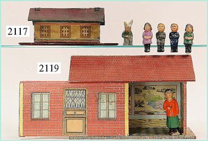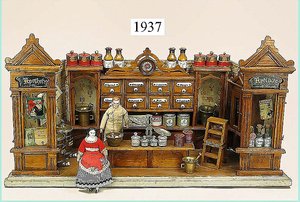 Puppenstuben-Kaufladen-Gehäuse, Gründerzeit, als Apotheke eingerichtet, 66 cm breit, 35 cm hoch, seitlich Schaufenster, mit reichhaltigem Apotheker-Zubehör, 2 Stubenpuppen, Orig.-Tapete an der Wand, alte Außenbemalung, dekor. Teil