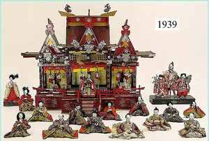 Szene, Muschelkalkpuppen, Japan, Sitzhöhe 10 cm, Sängerin Höhe 16 cm