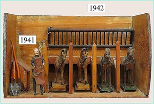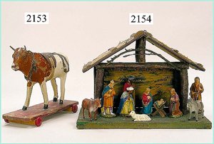 Pferdestall, 50 cm breit, 30 cm hoch, 27 cm tief, wohl 1x abgelaugt, außen überstrichen, 4 frühe Zugpferde, 15 cm, davon 2 Fell bezogen, um 1900, sowie Papiermaché beflockt, vor 1900