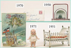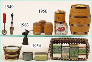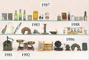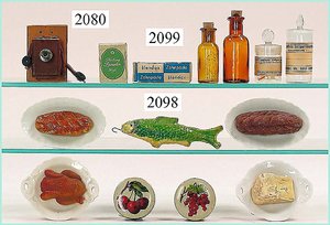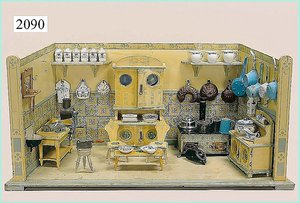 Puppenstuben-Bäckerei, 58 cm breit, 32 cm hoch, 30 cm tief, sehr schöne dekor. Bastelarbeit aus einem alten Puppenküchengehäuse, mit sehr reichhaltigem Zubehör, Keramik, Weißblechteile, Holzteile, teilw. alte Bemalung